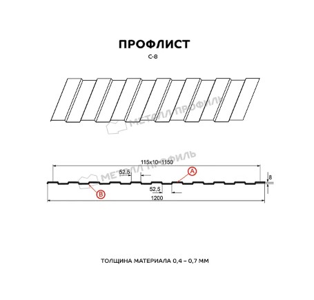 Профилированный лист с наиболее маленькой трапецией в каталоге Компании Металл Профиль. Назначение профиля С-8 – в большей степени дизайнерская функция, чем несущая. С-8 убедительно реализует такие задачи, как: внутренняя отделка индустриальных помещений, возведение ограждений, не подверженных высоким снеговым и ветровым нагрузкам, системы подвесных потолков, монтаж вентилируемых фасадов. Симметричная конфигурация профиля делает С-8 весьма удобным материалом для различных дизайнерских решений. Достаточная толщина стали – от 0,4 до 0,7 мм даёт возможность профлисту отлично справляться с любым своим назначением. А большая полезная ширина (1150 мм) помогает сэкономить на закупке профлистов. По вашему заказу мы можем изготовить листы металлопроката длиной от 0,5 до 12 метров.